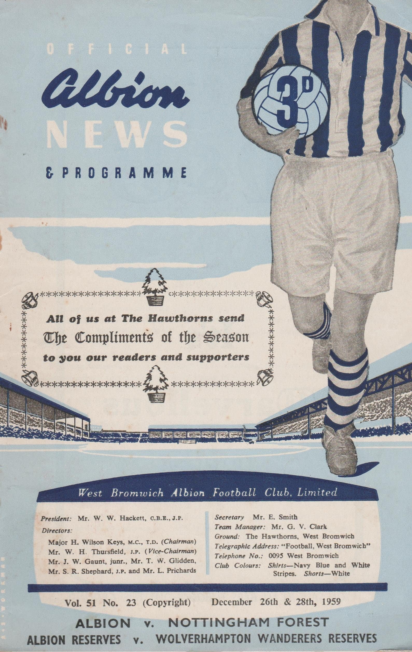 Match: West Bromwich Albion v Nottingham Forest Competition: League Division 1 Date: 26-Dec-1959 Comments: Joint issue for Wolverhampton Wanderers reserve game Rating: 3 Condition: Rusty staples, slight fold Weight in grams: 40