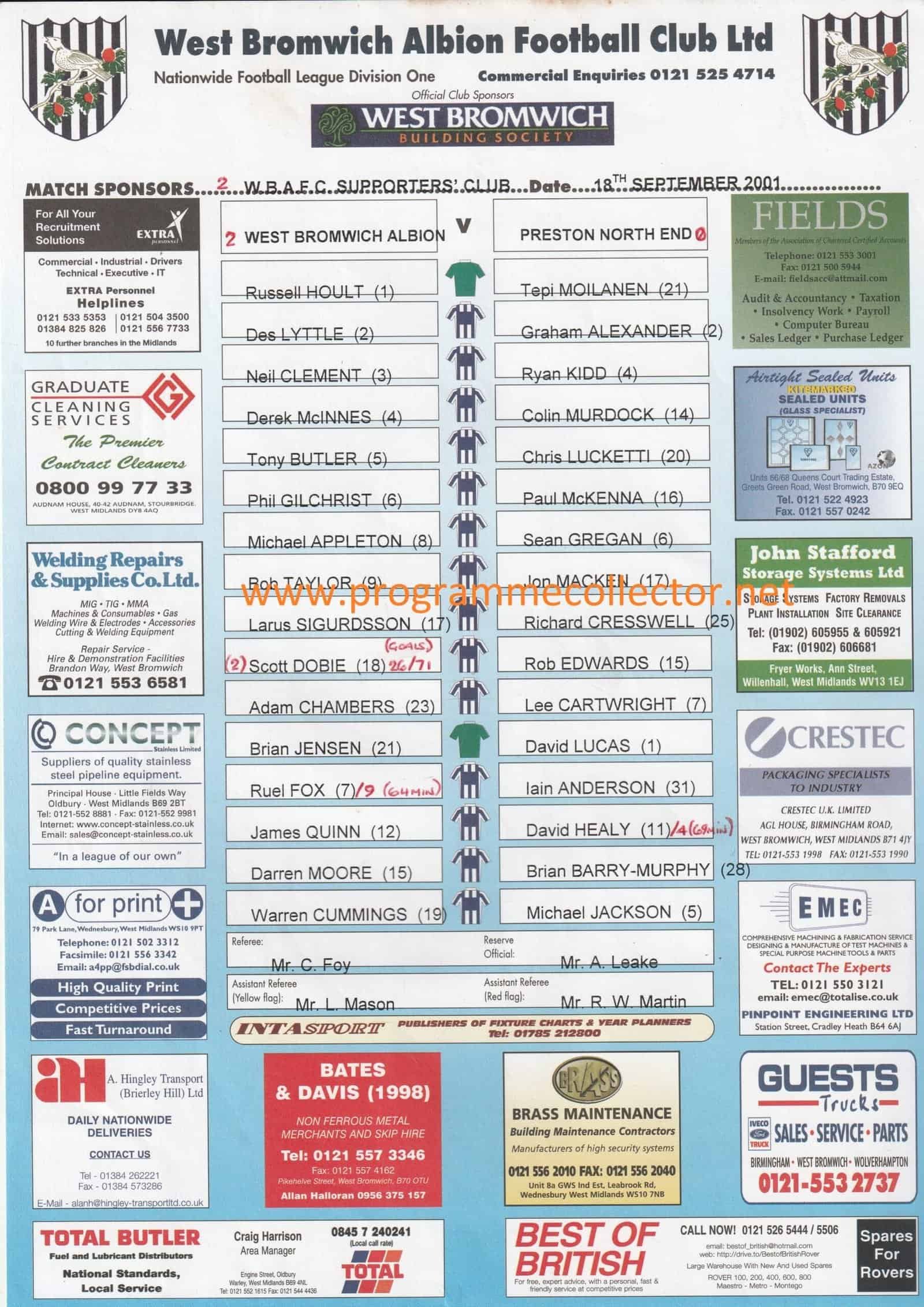 Match: West Bromwich Albion v Preston North End Competition: League Division 1 Date: 18-Sep-2001 Comments: Rating: 3 Condition: Team changes Weight in grams: 20