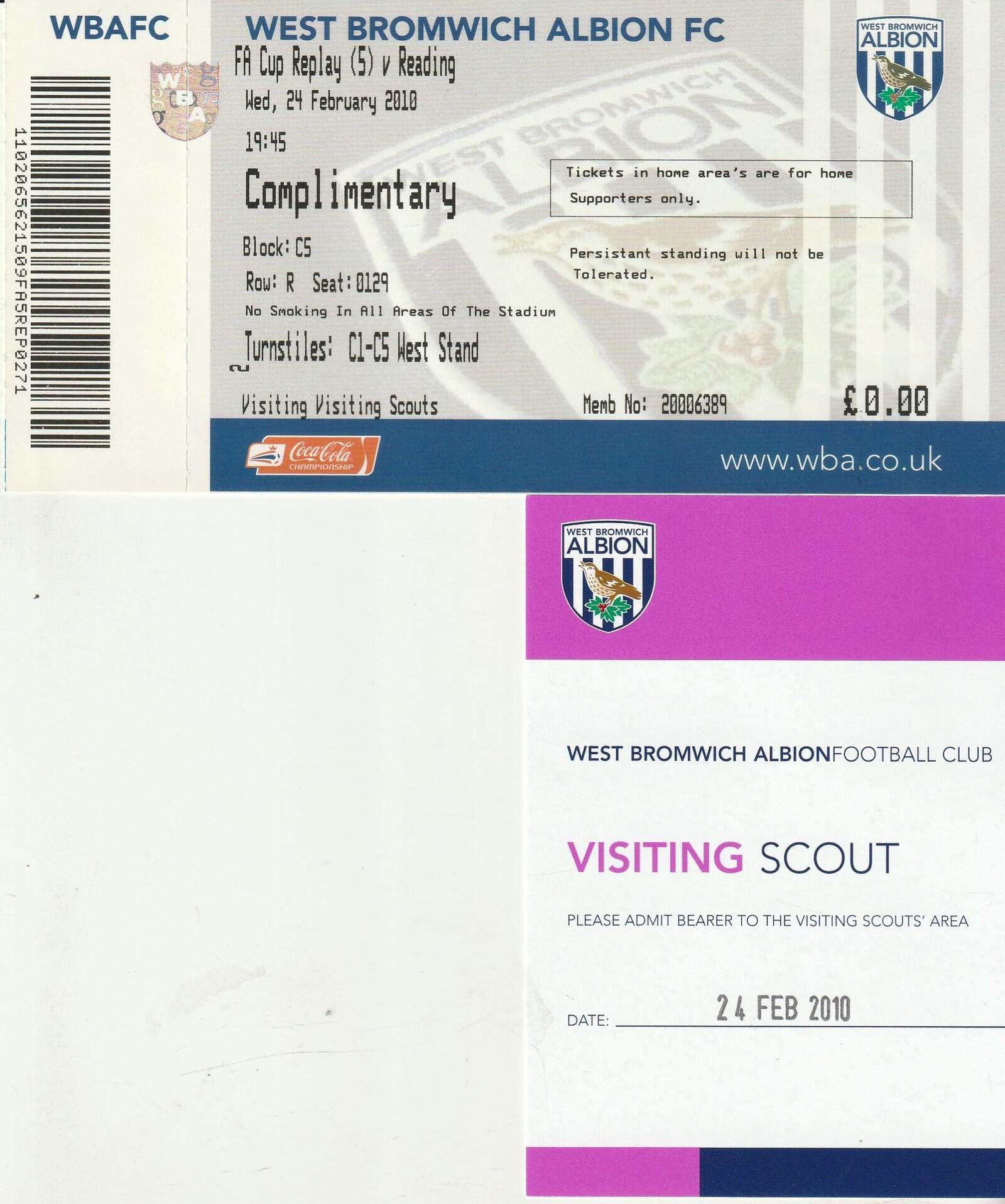 Match: West Bromwich Albion v Reading Competition: FA Cup 5th Round Replay Date: 24-02-2010 Comments: Includes ticket and lounge pass Rating: 4 Condition: Very good Weight in grams: 20