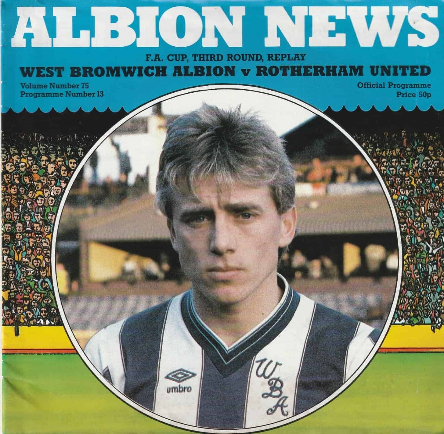Match: West Bromwich Albion v Rotherham United Competition: FA Cup 3rd Round Replay Date: 11-Jan-1984 Comments: Rating: 3 Condition: Corner turn on cover, Curving on edges Weight in grams: 100