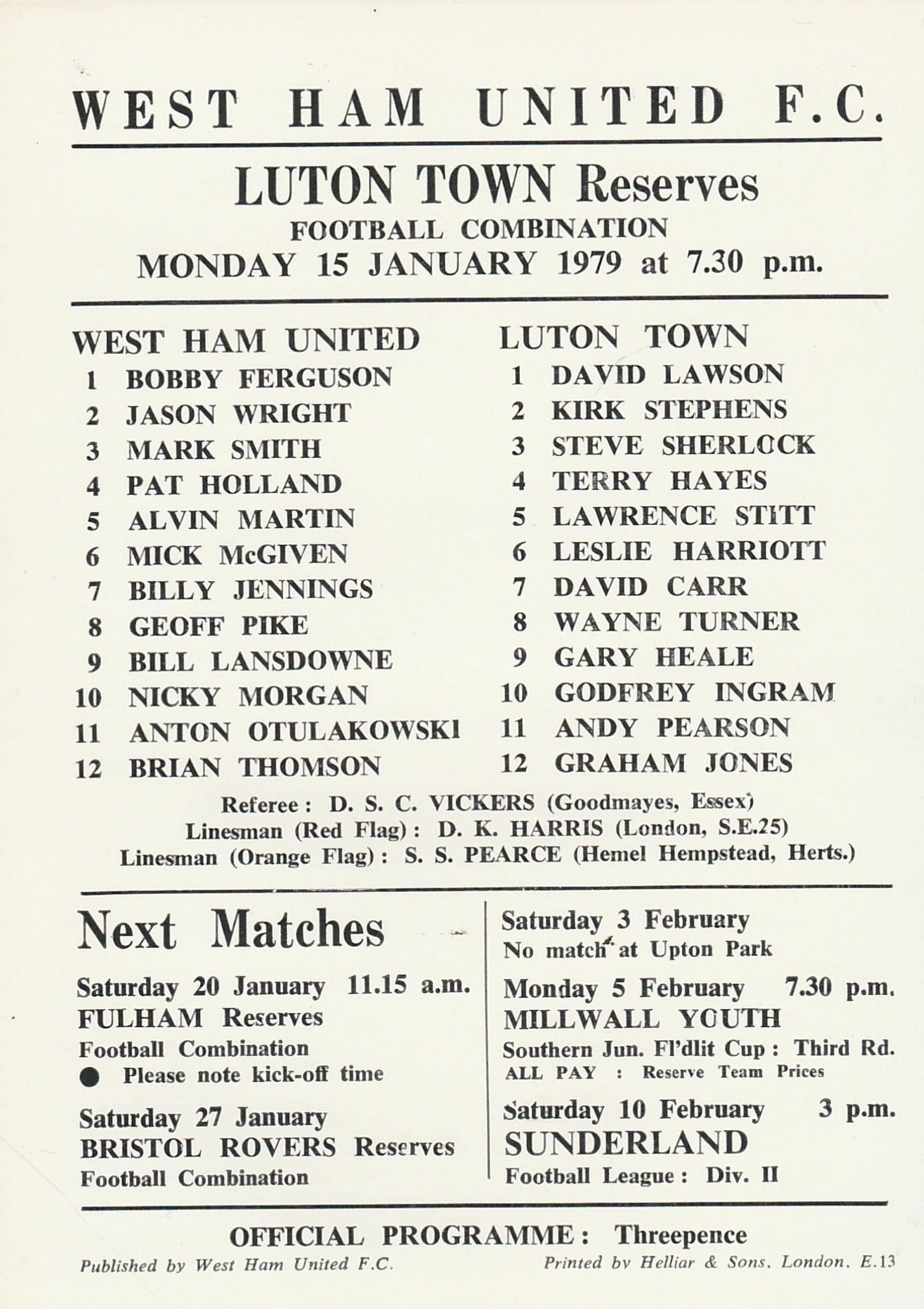 Match: West Ham United Reserves v Luton Town Reserves Competition: Football Combination Date: 15-Jan-1979 Comments: Single sheet Rating: 4 Condition: Very good Weight (grams): 20