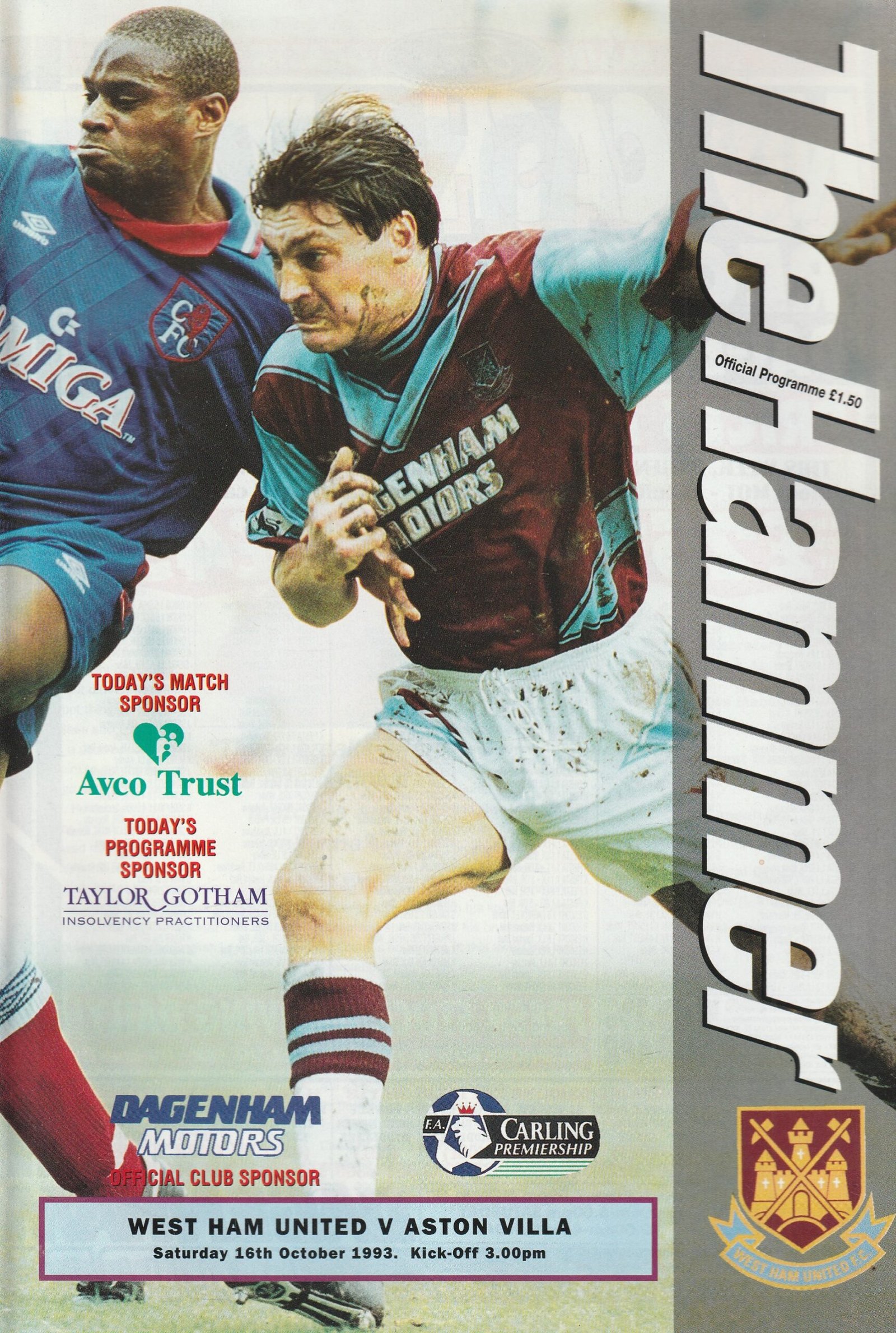 Match: West Ham United v Aston Villa Competition: Premier League Date: 16-Oct-1993 Comments: Rating: 4 Condition: Very good Weight (grams): 140
