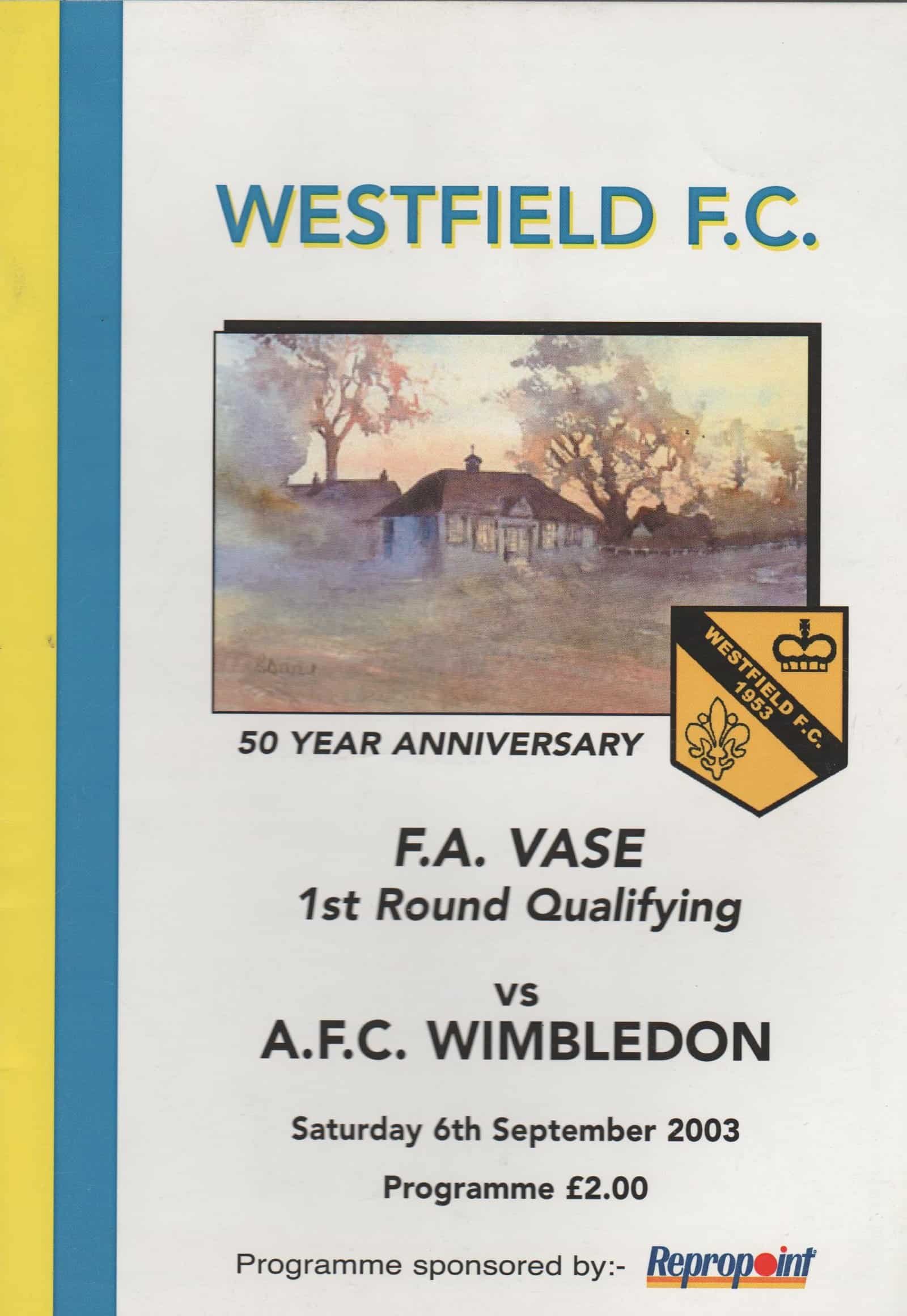 Match: Westfield FC v AFC Wimbledon Competition: Seagraves Haulage Premier Division Date: 06-Sep-2003 Comments: Rating: 4 Condition: Very good Weight in grams: 60