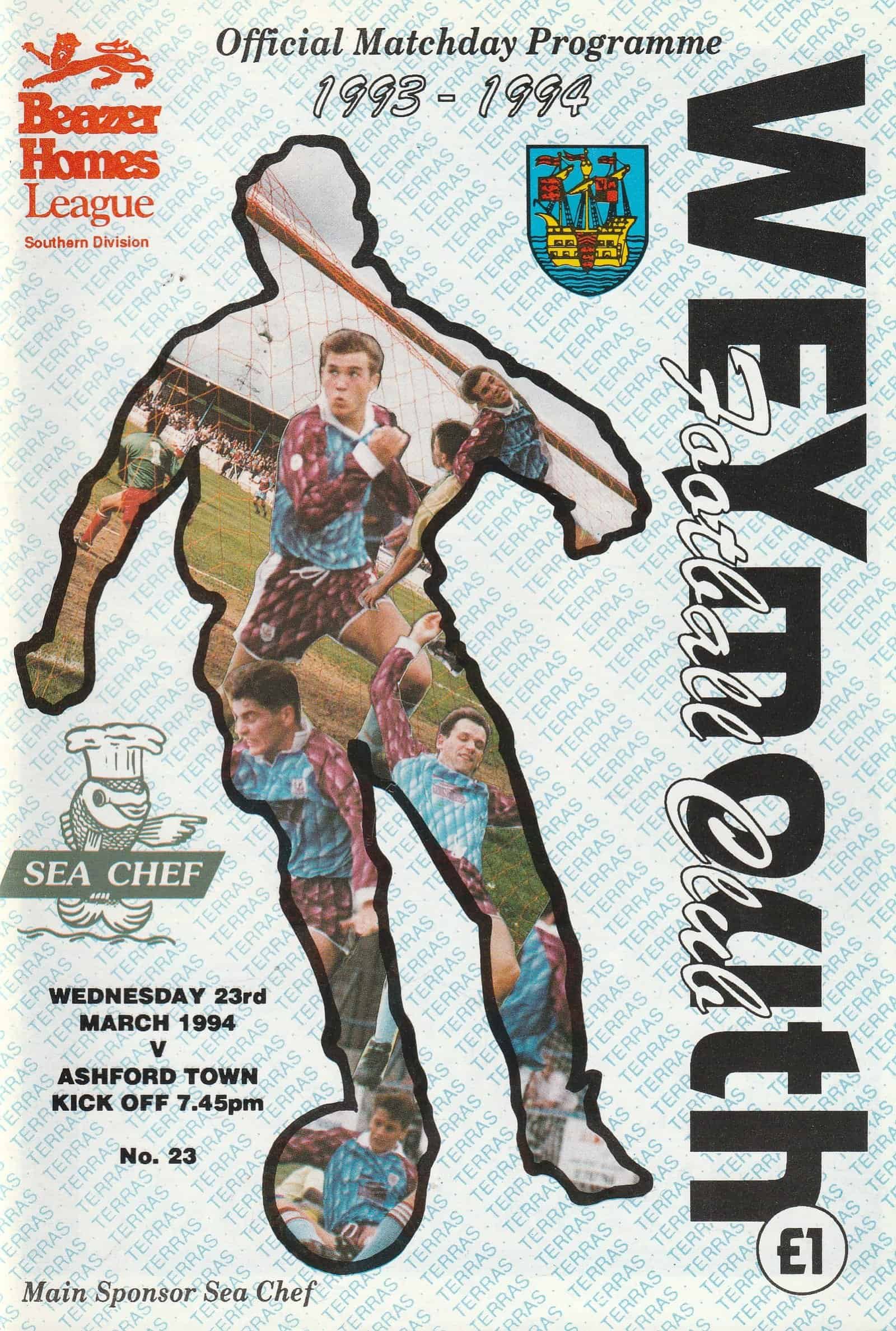 Match: Weymouth v Ashford Town Competition: Beazer Homes League Southern Division Date: 23-Mar-1994 Comments: Rating: 4 Condition: Very good Weight in grams: 100