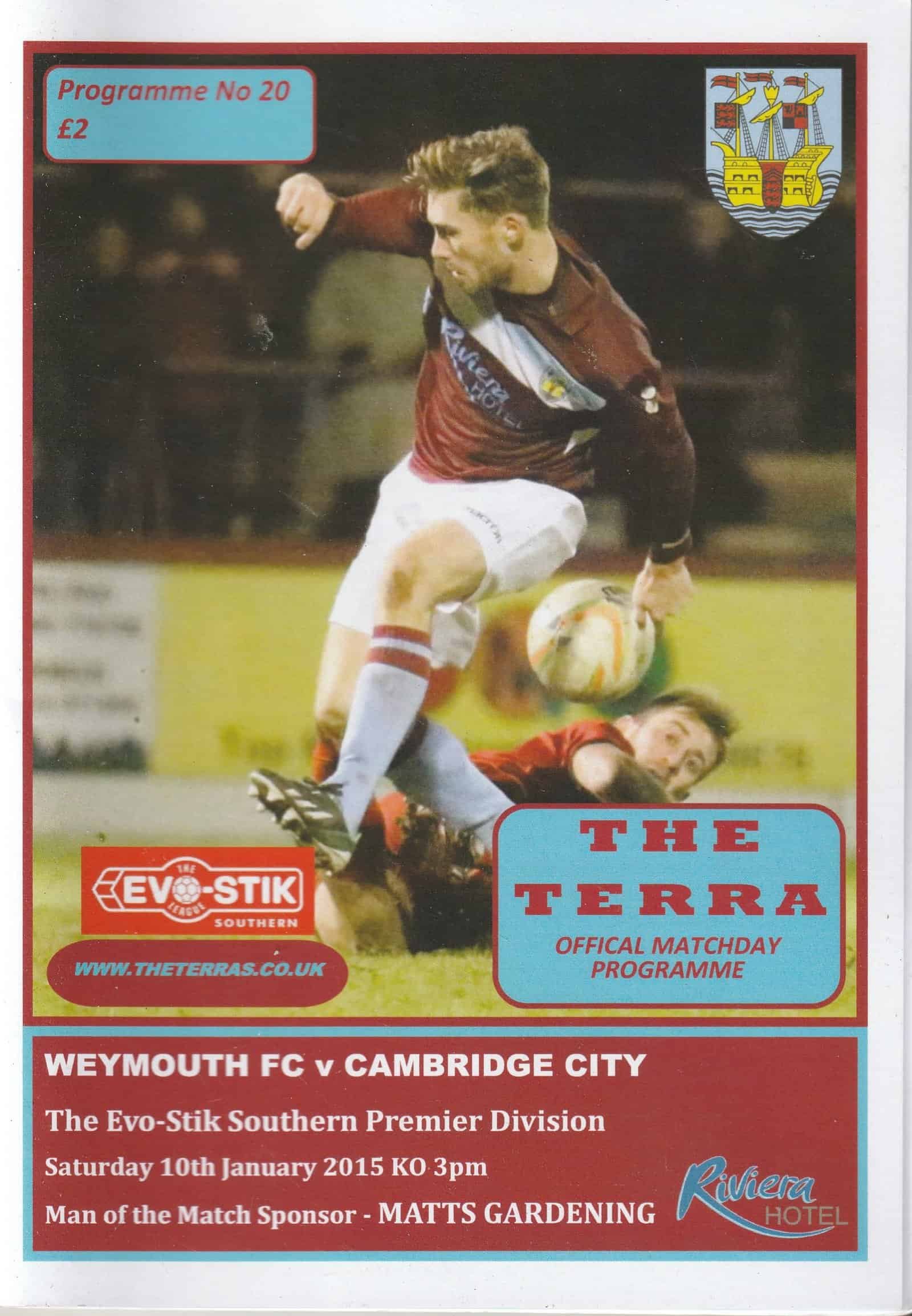 Match: Weymouth v Cambridge City Competition: Evo-Stik Southern League Premier Division Date: 10-Jan-2015 Comments: Includes team sheet Rating: 4 Condition: Very good Weight in grams: 120