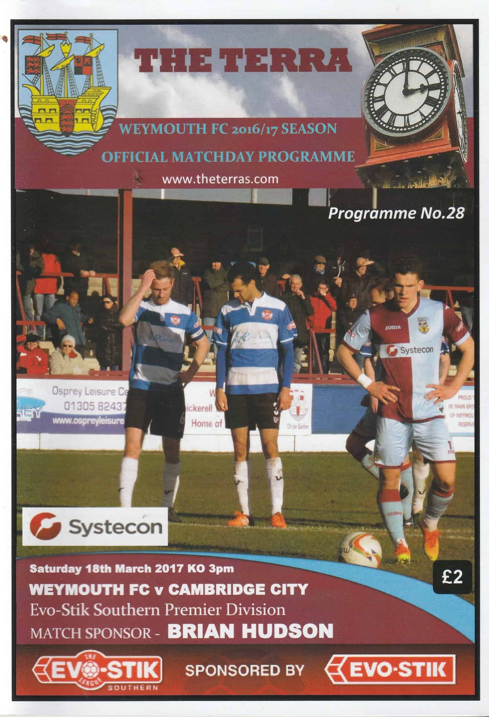 Match: Weymouth v Cambridge City Competition: Evo-Stik Southern League Premier Division Date: 18-Mar-2017 Comments: Rating: 4 Condition: Very good Weight in grams: 120