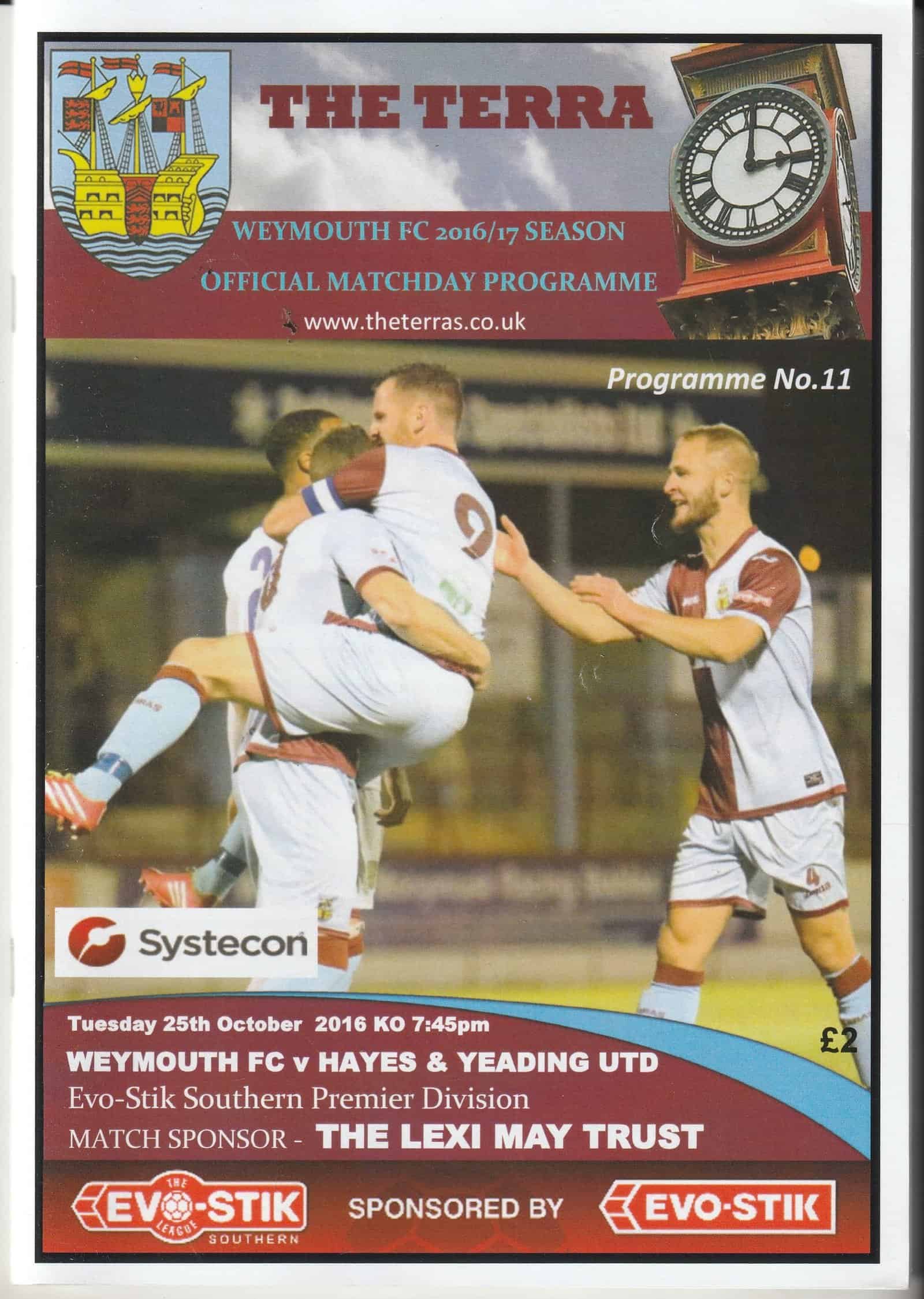 Match: Weymouth v Hayes & Yeading United Competition: Evo-Stik Southern League Premier Division Date: 25-Oct-2016 Comments: Rating: 4 Condition: Very good Weight in grams: 120