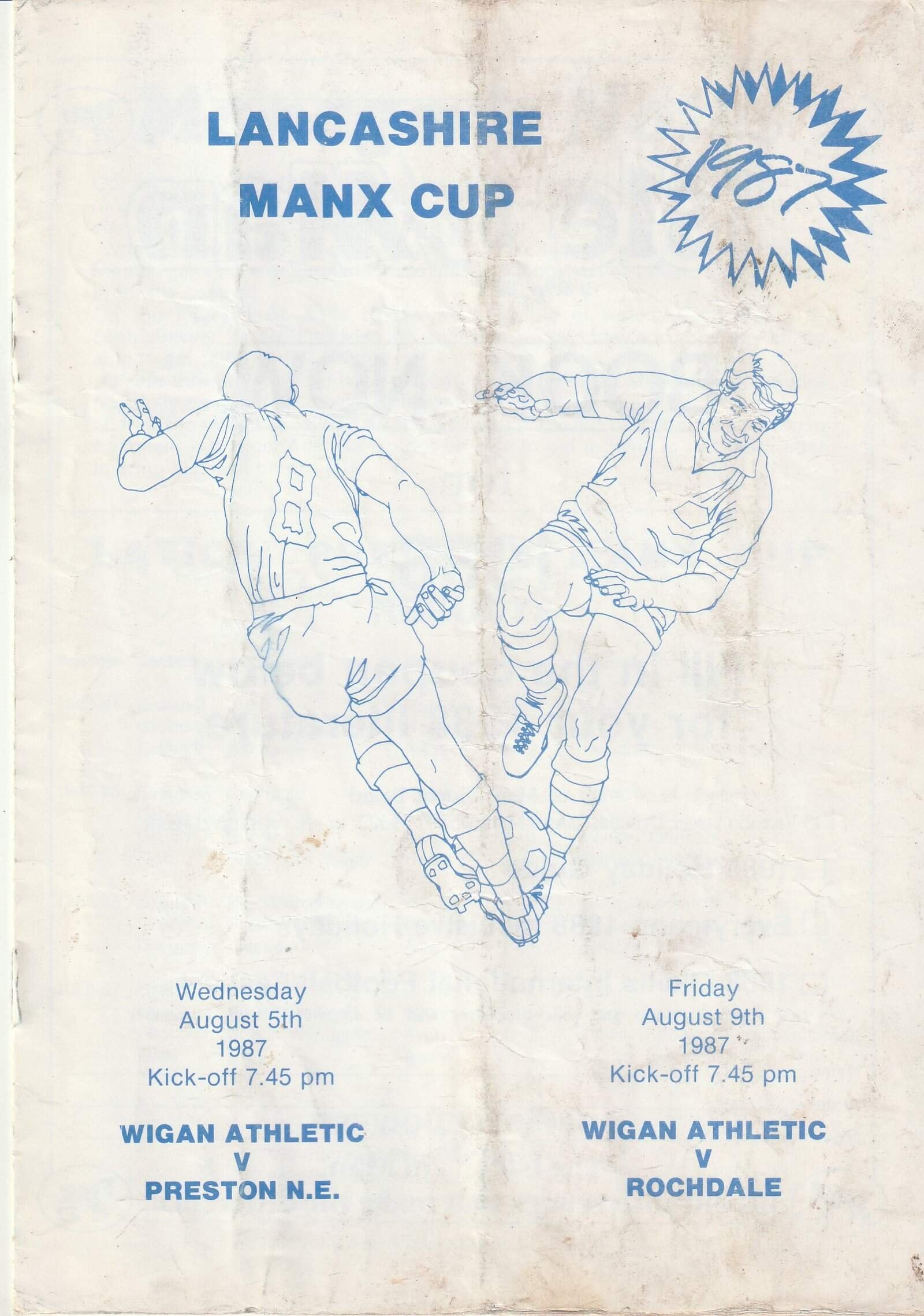 Match: Wigan Athletic v Preston North End Competition: Lancashire Marsden Cup Date: 05-Aug-1987 Comments: Joint issue for Rochdale fixture Rating: 3 Condition: Fold, soiling on cover Weight in grams: 60