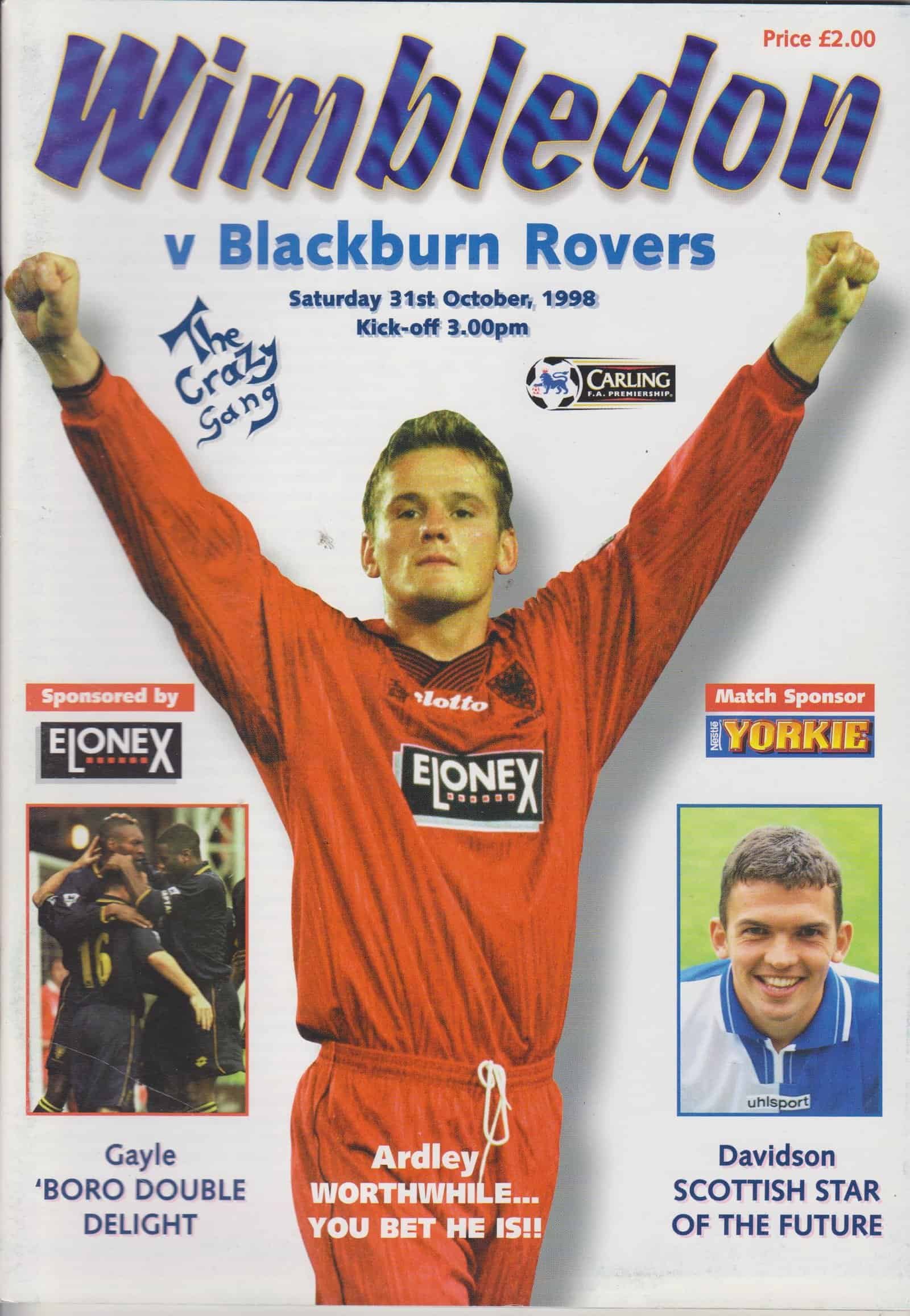 Match: Wimbledon v Blackburn Rovers Competition: Premier League Date: 31-Oct-1998 Comments: Rating: 4 Condition: Very good Weight in grams: 140