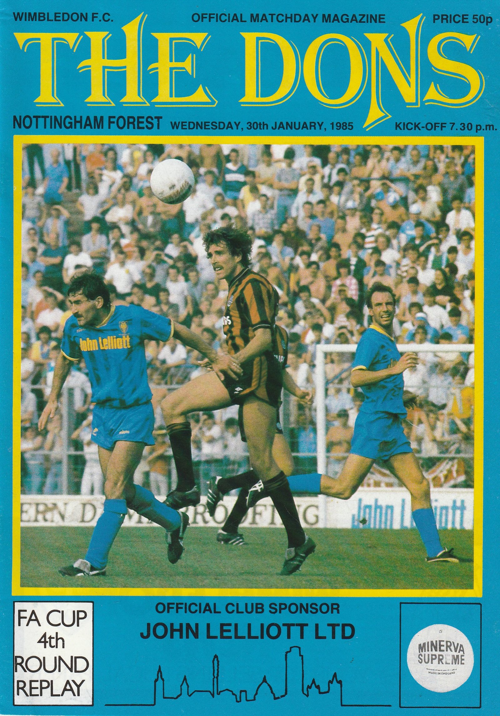 Match: Wimbledon v Nottingham Forest Competition: FA Cup 4th Round Replay Date: 30-Jan-1985 Comments: Rating: 3 Condition: Slight wear to edges of page2/3 Weight in grams: 100