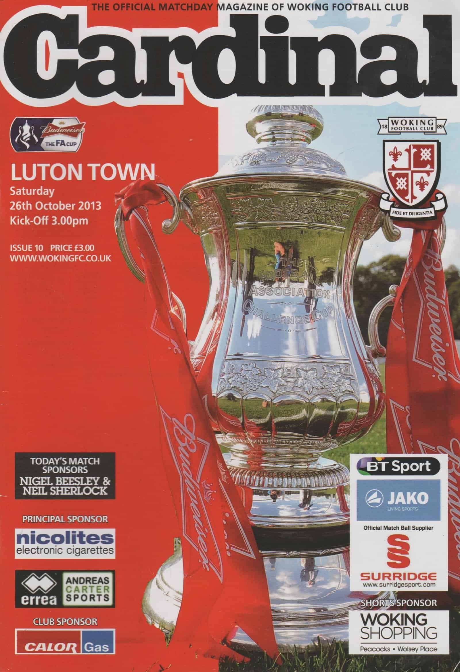Match: Woking v Luton Town Competition: FA Cup 4th Qualifying Round Date: 26-Oct-2013 Comments: Rating: 4 Condition: Slight corner turn Weight in grams: 140