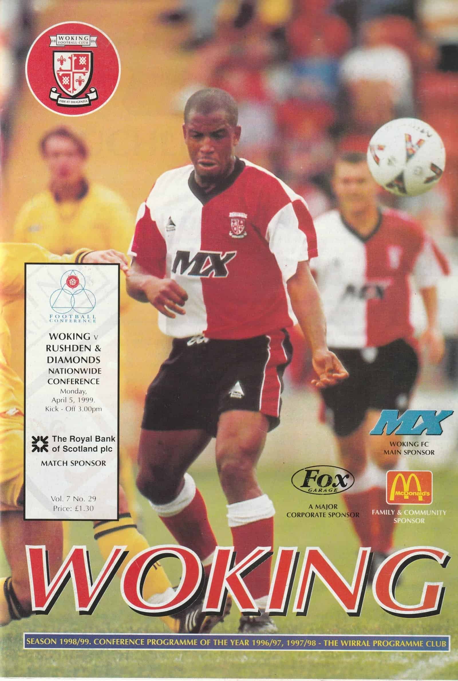 Match: Woking v Rushden & Diamonds Competition: Nationwide Conference Date: 05-Apr-1999 Comments: Rating: 4 Condition: Very good Weight in grams: 140