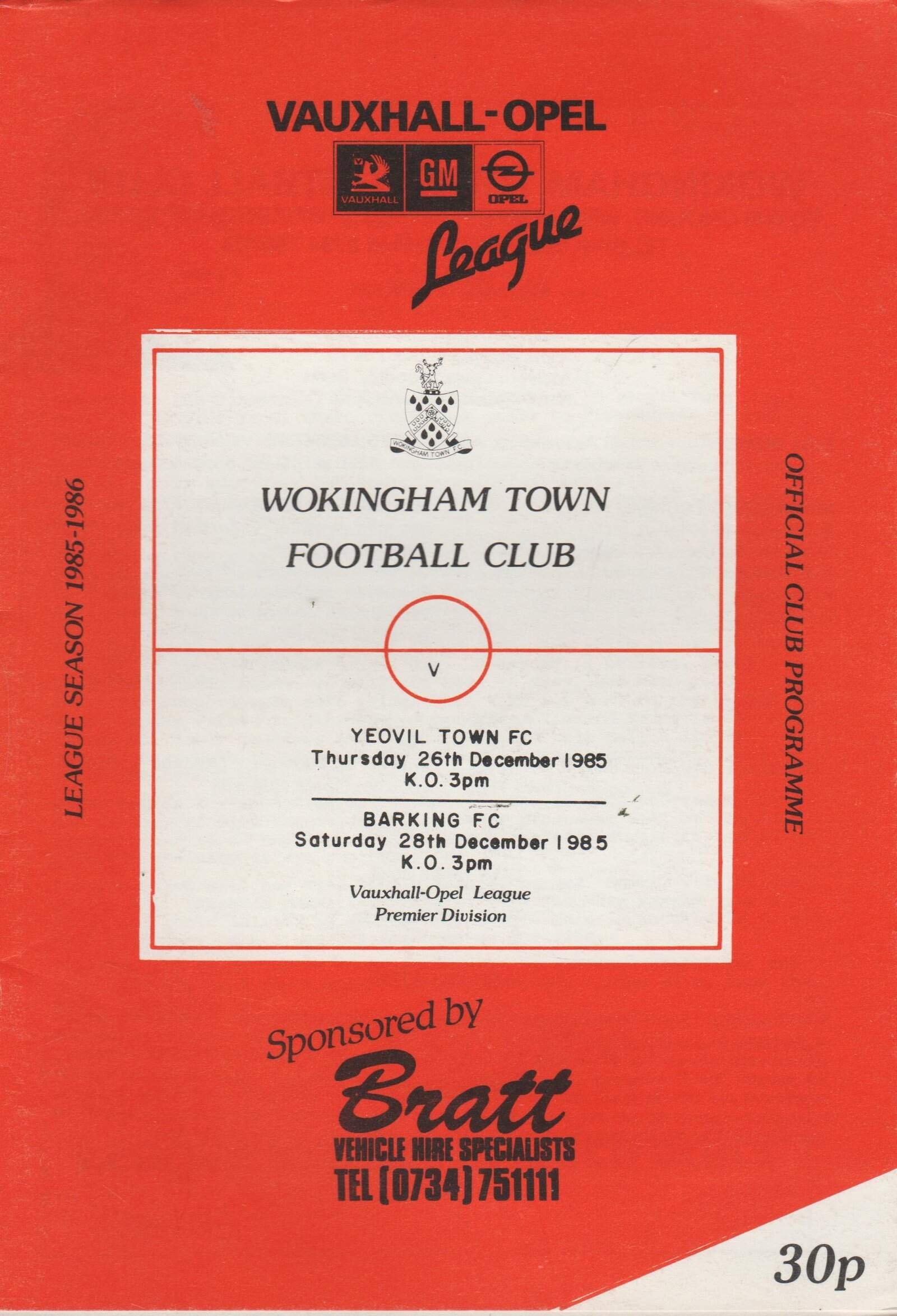 Match: Wokingham Town v Barking Competition: Vauxhall Opel League Premier Division Date: 26-Dec-1985 Comments: Joint issue for Yeovil game Rating: 4 Condition: Very good Weight in grams: 60