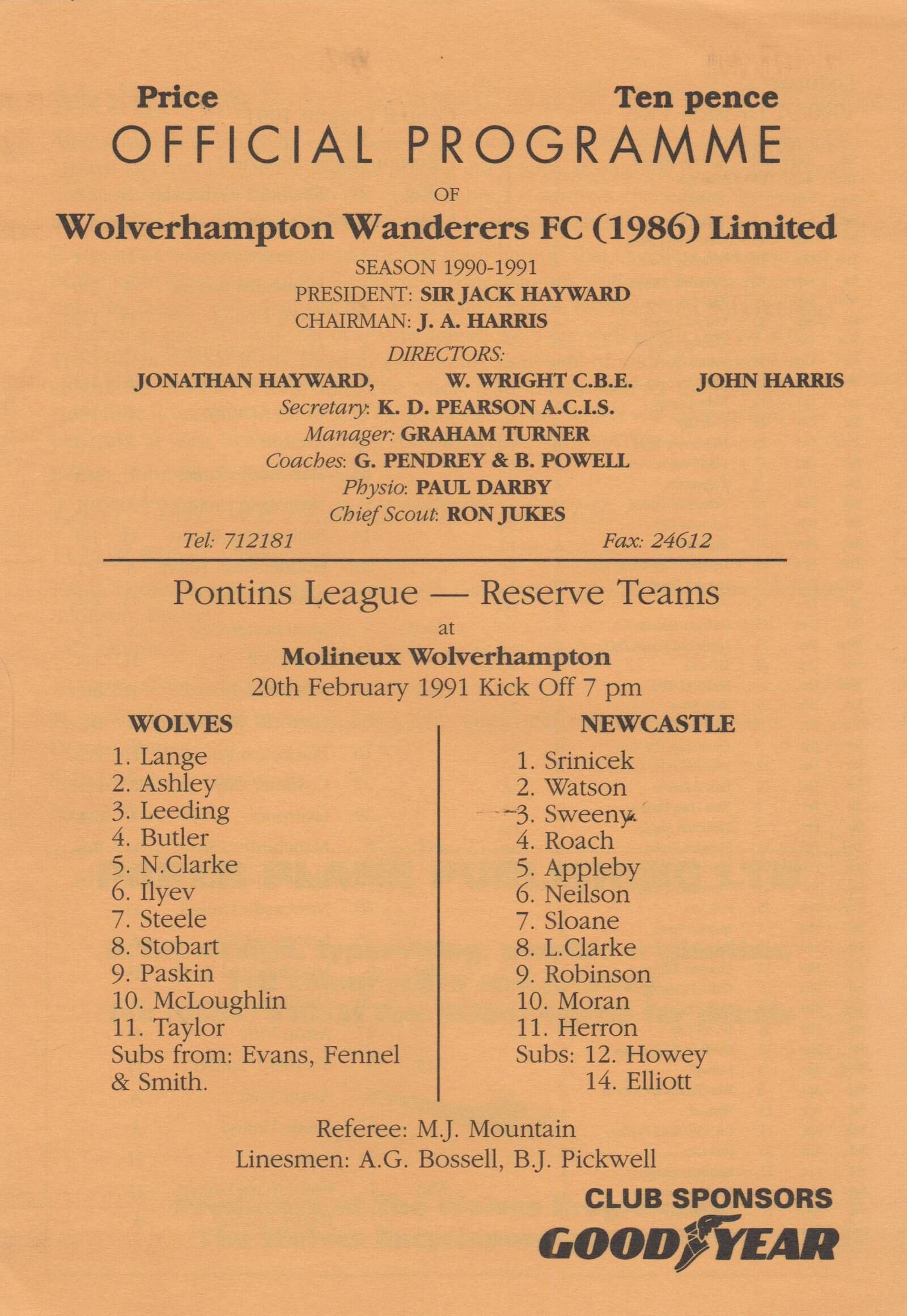 Match: Wolverhampton Wanderers Reserves v Newcastle United Reserves Competition: Pontins League Division 1 Date: 20-Feb-1991 Comments: 4 page issue Rating: 4 Condition: Very good Weight in grams: 20