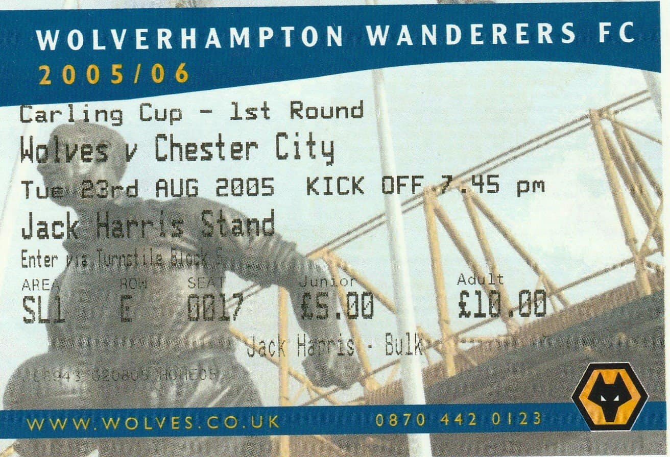 Match: Wolverhampton Wanderers v Chester City Competition: Carling Cup 1st Round Date: 23-Aug-2005 Comments: Rating: 4 Condition: Very good Weight in grams: 20