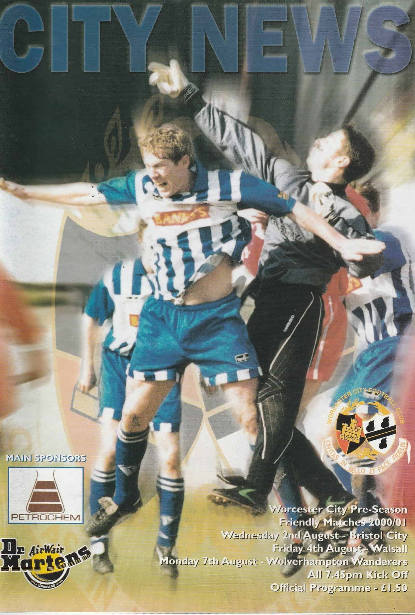 Match: Worcester City v Walsall Competition: Friendly Date: 04-Aug-2000 Comments: Joint issue for Bristol City and Wolverhampton Wanderers fixtures Rating: 4 Condition: Very good Weight in grams: 160