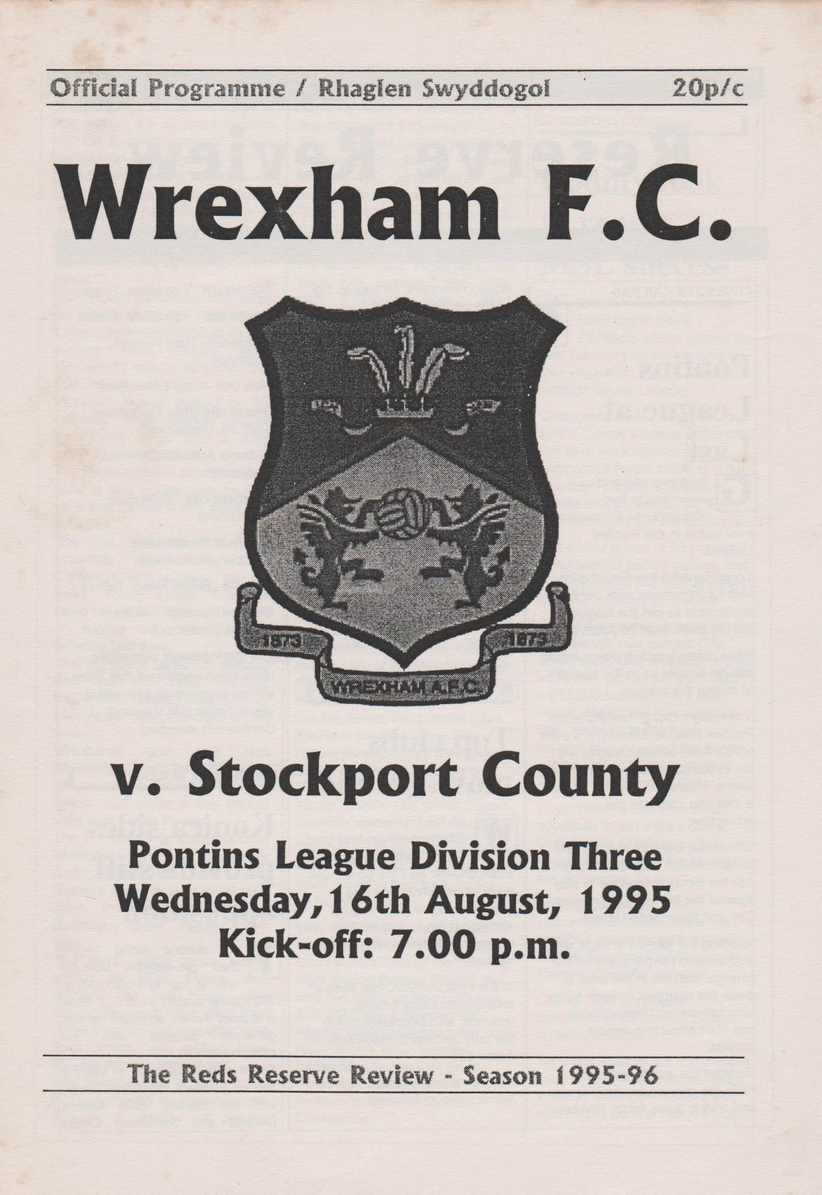 Match: Wrexham Reserves v Stockport County Reserves Competition: Pontins League Division 3 Date: 16-Aug-1995 Comments: 4 page issue Rating: 4 Condition: Very good Weight in grams: 20