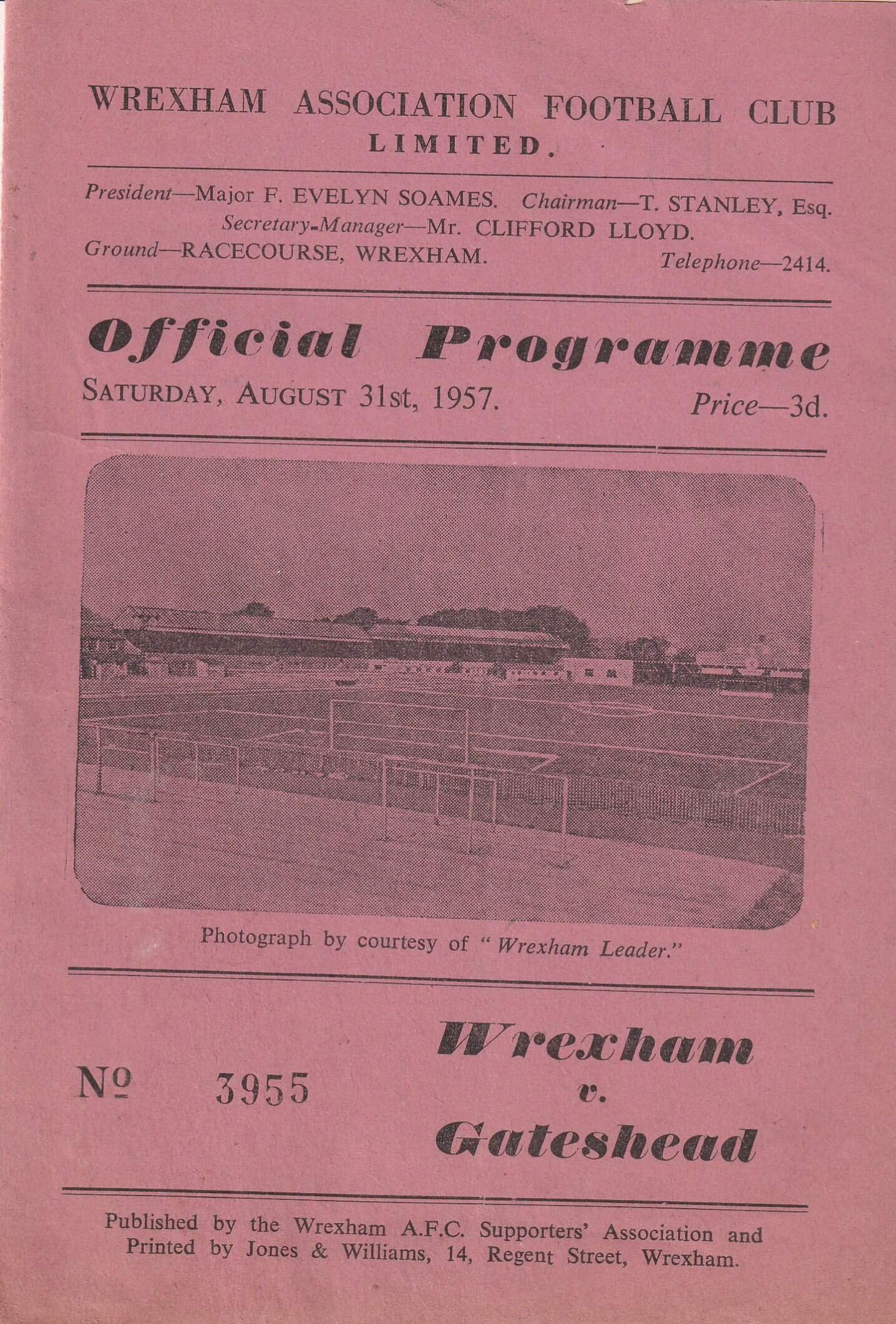 Match: Wrexham v Gateshead Competition: League Division 3 North Date: 31-Aug-1957 Comments: Rating: 3 Condition: Faint fold on cover, score written on team line ups page, rudty staple Weight in grams: 60