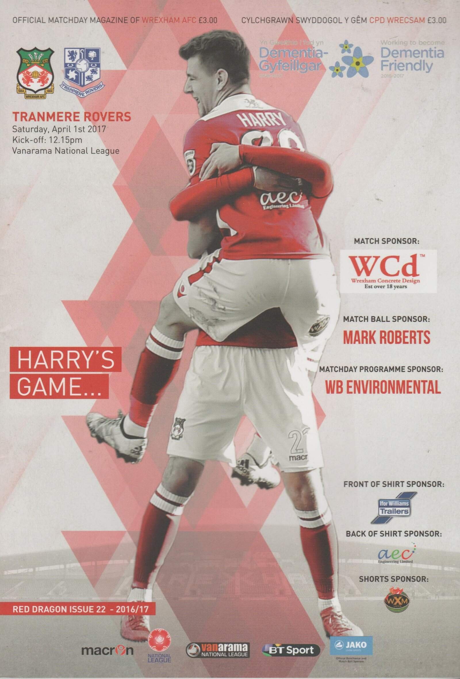 Match: Wrexham v Tranmere Rovers Competition: Vanarama National League Date: 01-Apr-2017 Comments: Rating: 4 Condition: Very good Weight in grams: 180