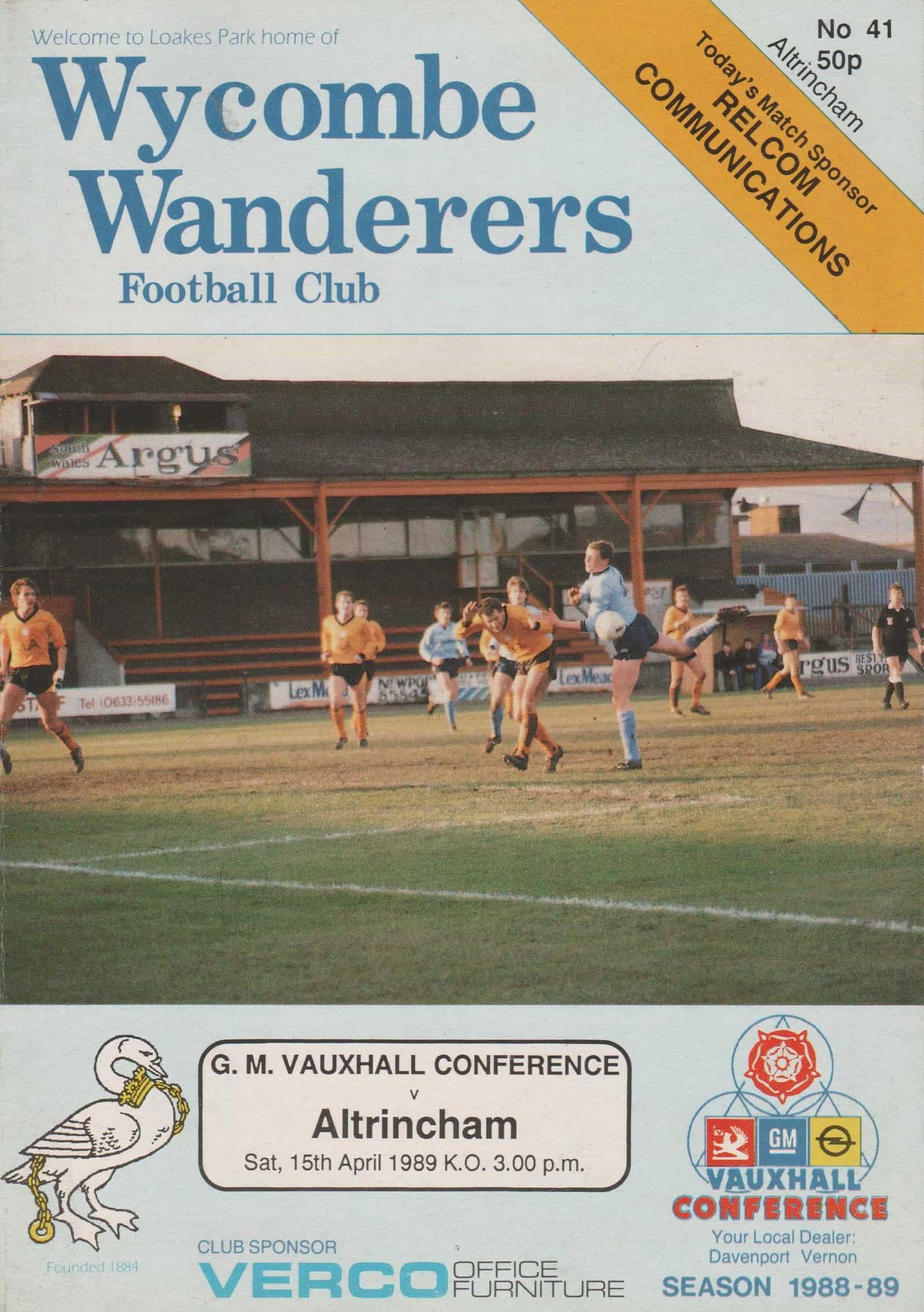 Match: Wycombe Wanderers v Altrincham Competition: GM Vauxhall Conference Date: 15-Apr-1989 Comments: Rating: 3 Condition: Team changes Weight in grams: 80