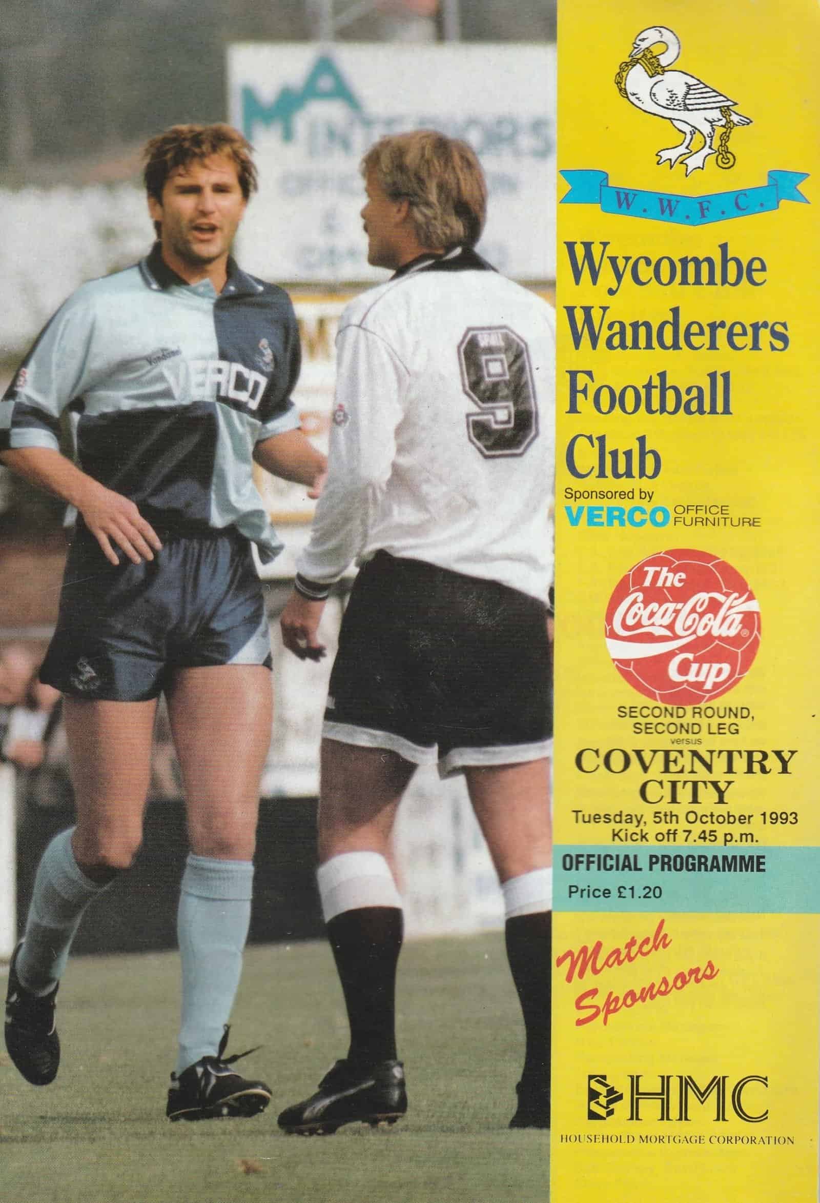 Match: Wycombe Wanderers v Coventry City Competition: Coca Cola Cup 2nd Round 2nd leg Date: 05-Oct-1993 Comments: Rating: 4 Condition: Very good Weight in grams: 140