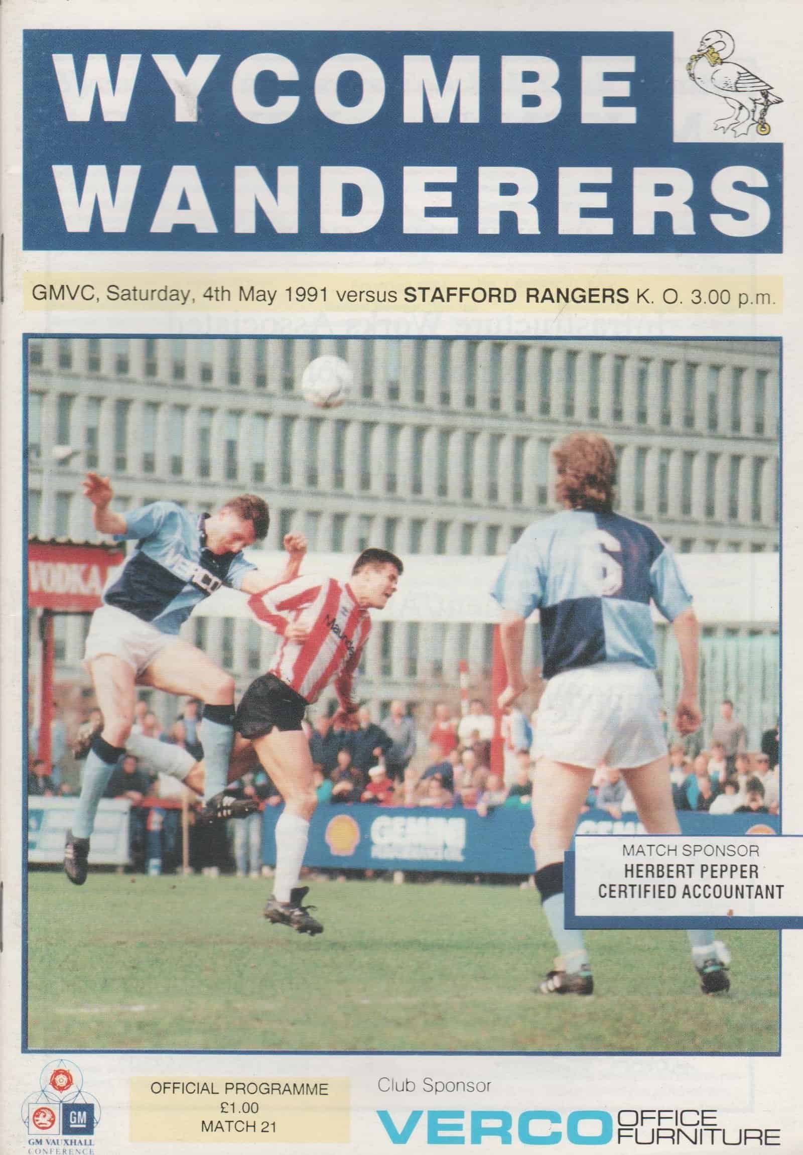 Match: Wycombe Wanderers v Stafford Rangers Competition: GM Vauxhall Conference Date: 04-May-1991 Comments: First season at Adams Park Rating: 4 Condition: Very good Weight in grams: 80