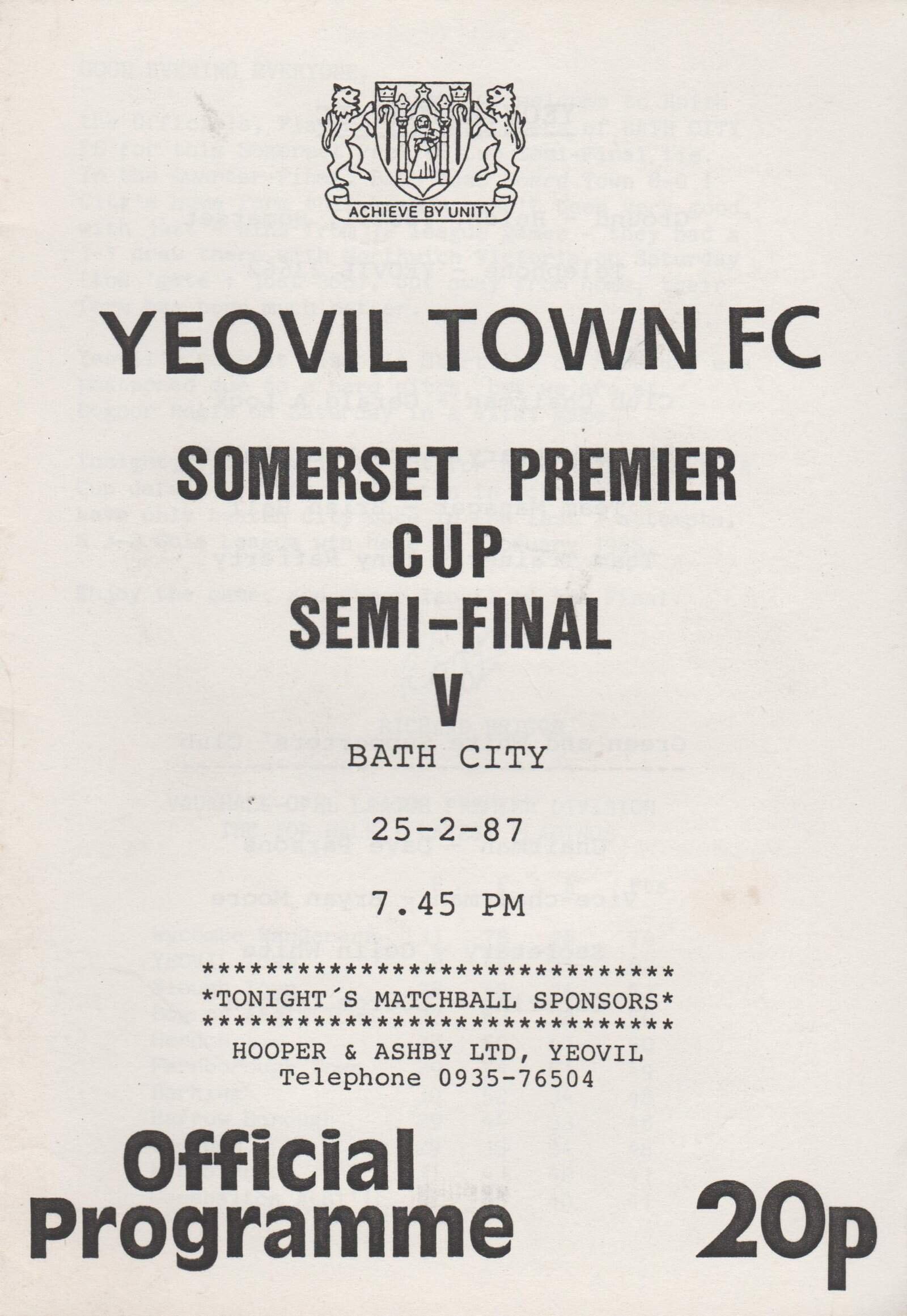 Match: Yeovil Town v Bath City Competition: Somerset Premier Cup Semi Final Date: 25-Feb-1987 Comments: Rating: 4 Condition: Very good Weight in grams: 60