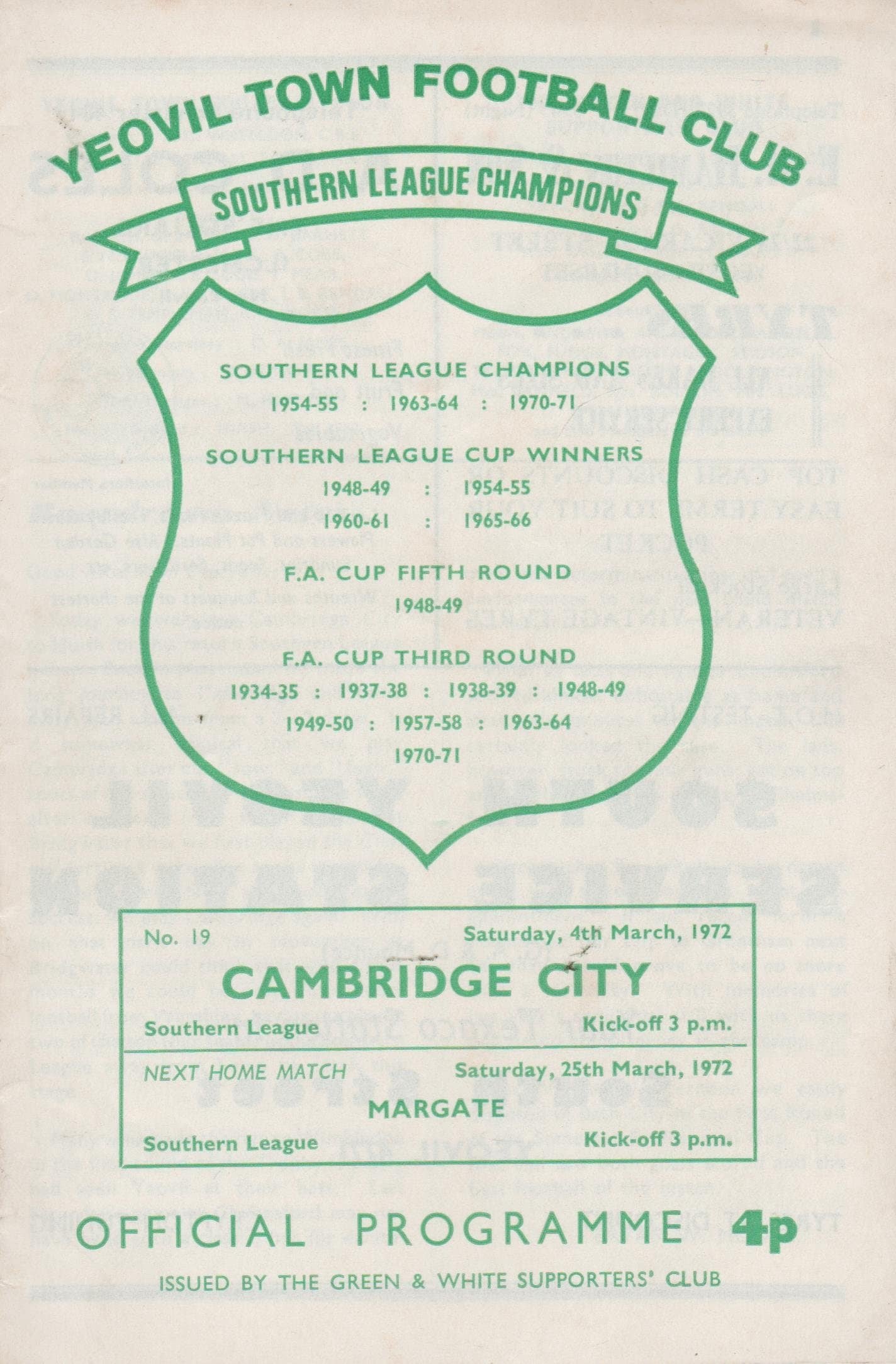 Match: Yeovil Town v Cambridge City Competition: Southern League Date: 04-Mar-1972 Comments: Rating: 4 Condition: Faint mark on back Weight in grams: 40