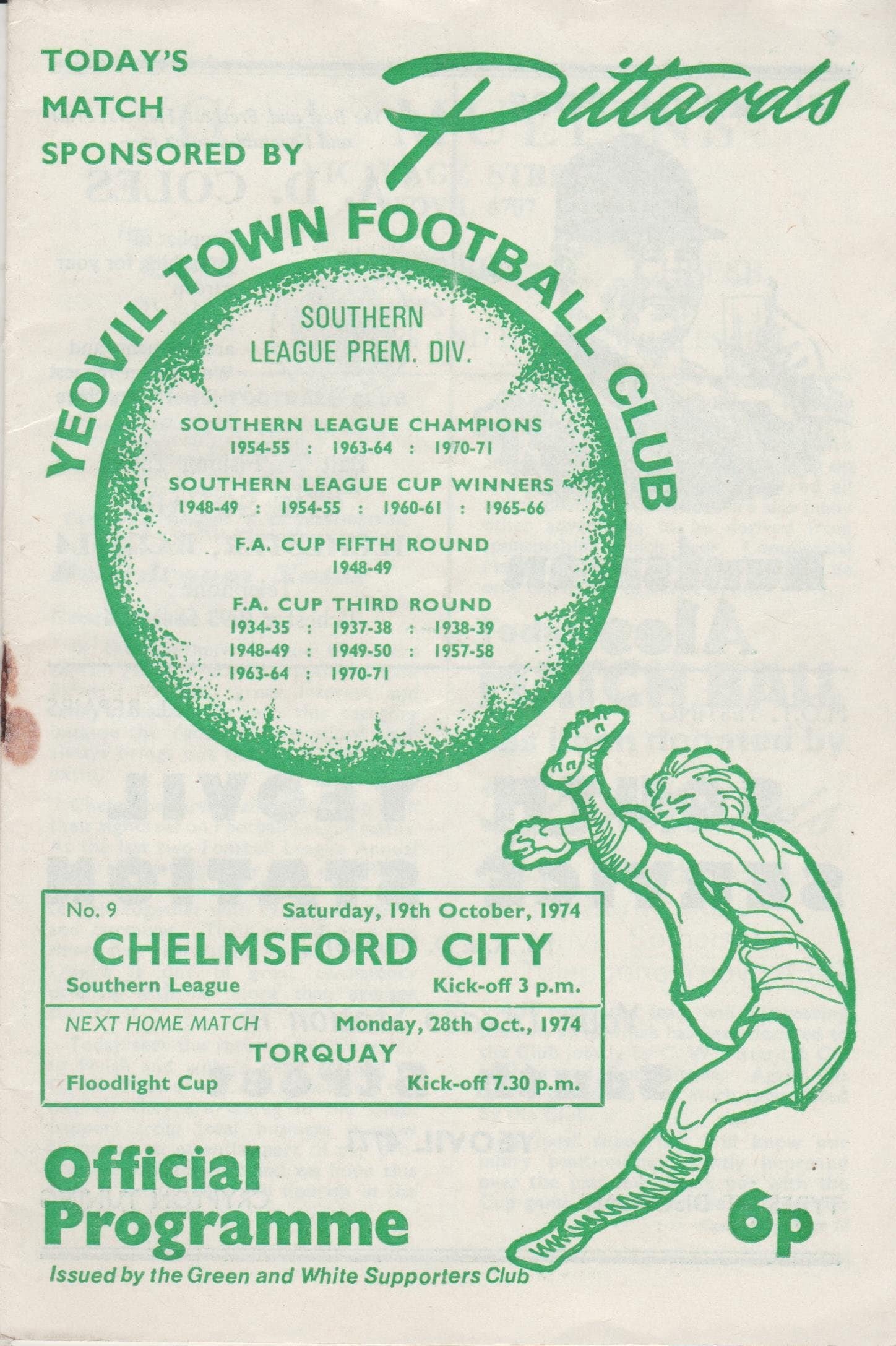 Match: Yeovil Town v Chelmsford City Competition: Southern League Date: 19-Oct-1974 Comments: Rating: 3 Condition: Fold, rusty staple/bleed Weight in grams: 40