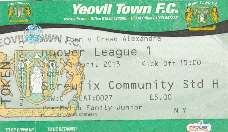 Match: Yeovil Town v Crewe Alexandra Competition: Sky Bet Championship Date: 20-Apr-2013 Comments: Rating: 3 Condition: Fold Weight in grams: 10