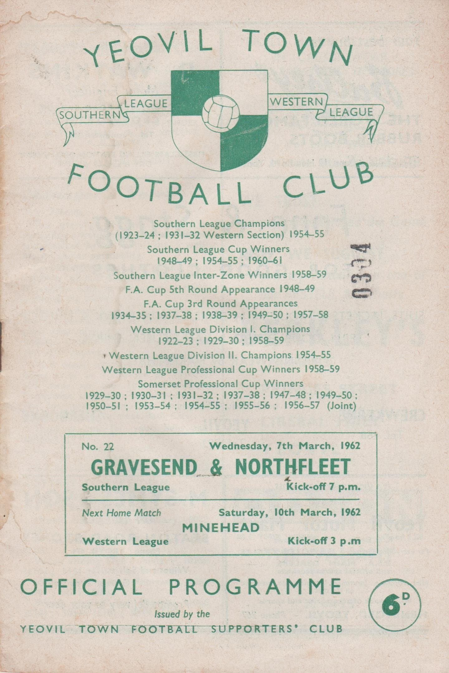 Match: Yeovil Town v Gravesend & Northfleet Competition: Southern League Date: 07-Mar-1962 Comments: Rating: 4 Condition: Water stainned Weight in grams: 40