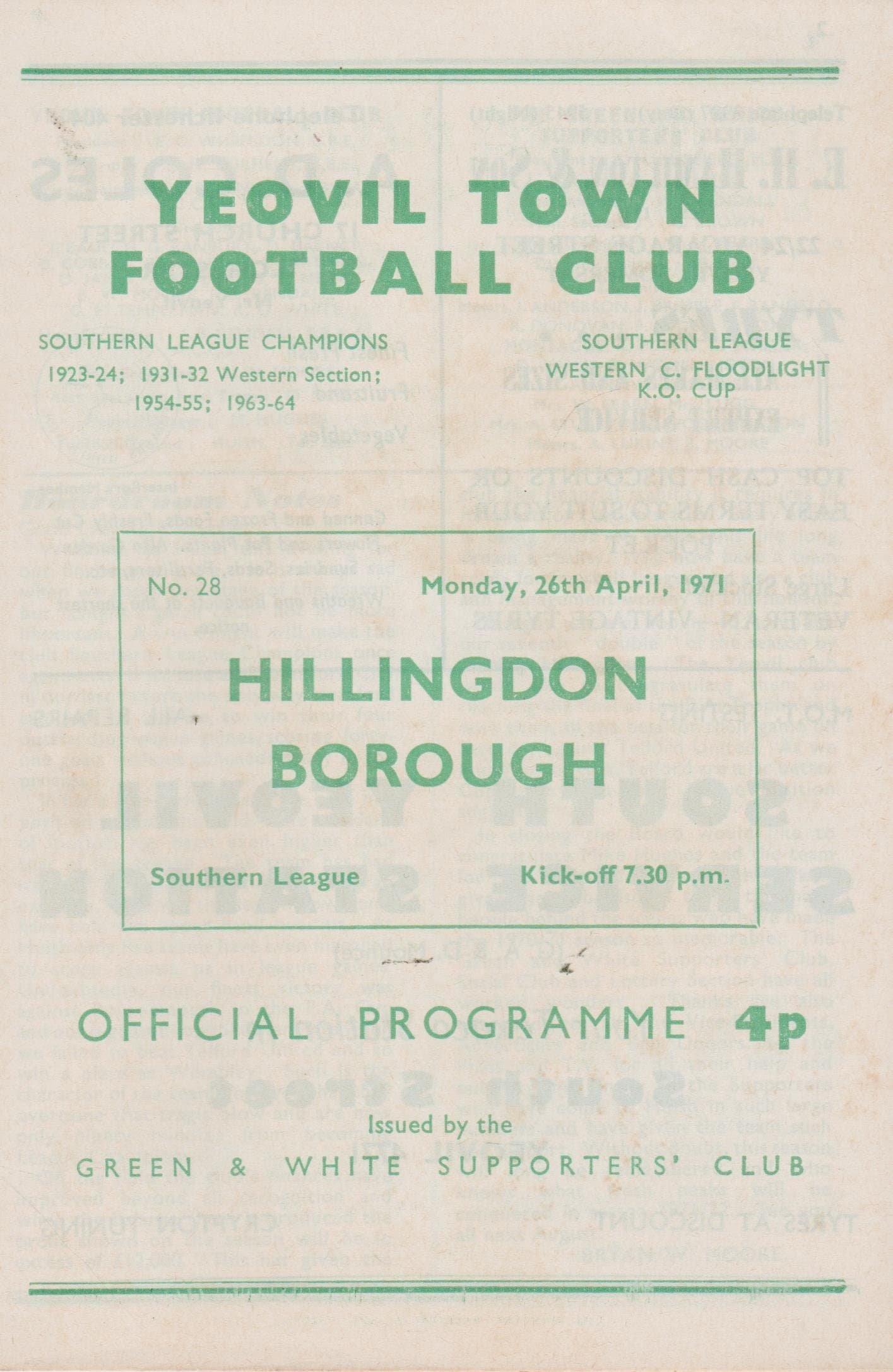 Match: Yeovil Town v Hillingdon Borough Competition: Southern League Date: 26-Apr-1971 Comments: Rating: 4 Condition: Very good Weight in grams: 40