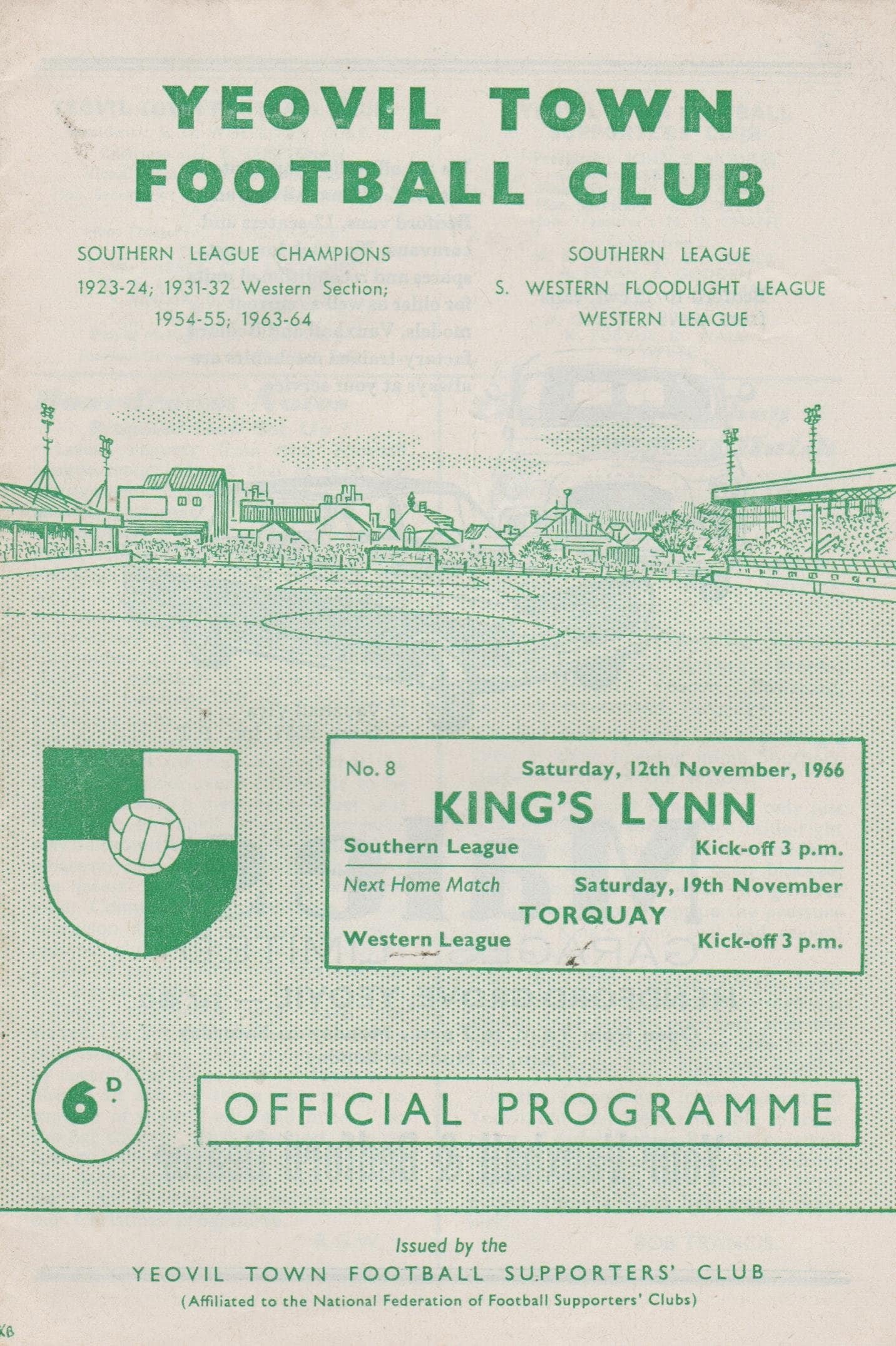 Match: Yeovil Town v King’s Lynn Competition: Southern League Date: 12-Nov-1966 Comments: Rating: 3 Condition: Nick on edge of cover, Slight mark on back Weight in grams: 40