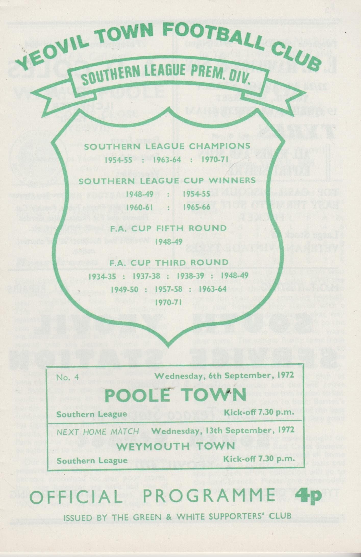 Match: Yeovil Town v Poole Town Competition: Southern League Date: 06-Sep-1972 Comments: Rating: 4 Condition: Very good Weight in grams: 40