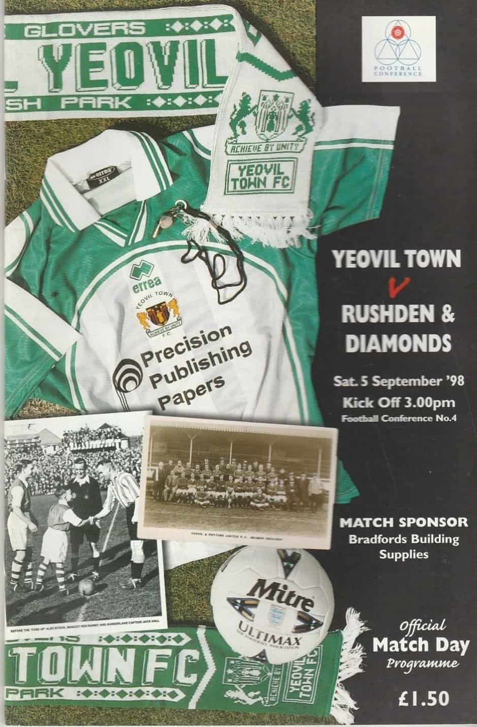 Match: Yeovil Town v Rushden & Diamonds Competition: National Conference Date: 05-Sep-1998 Comments: Rating: 4 Condition: Very good Weight in grams: 160