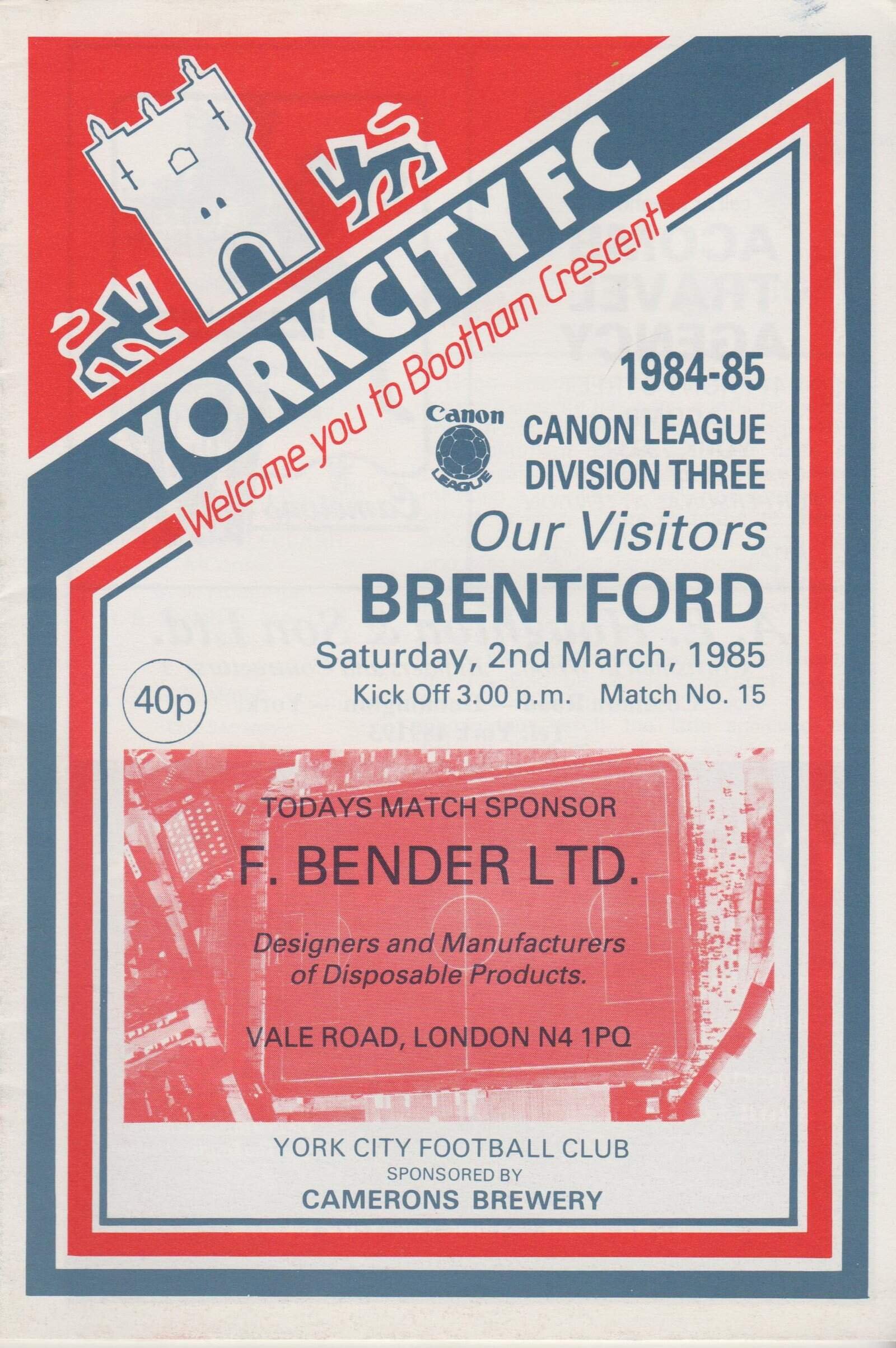 Match: York City v Brentford Competition: League Division 3 Date: 02-Mar-1985 Comments: Rating: 4 Condition: Very good Weight in grams: 80