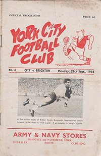 Match: York City v Brighton and Hove Albion Competition: League Division 4 Date: 28-09-1964 Comments: Rating: 3 Condition: Crease, Foxing to cover and internal pages, team changes, score on fixtures page Weight in grams: 40
