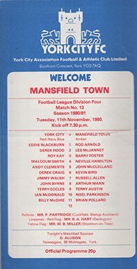 Match: York City v Mansfield Town Competition: League Division 4 Date: 11-11-1980 Comments: Rating: 3 Condition: Fold Weight in grams: 40