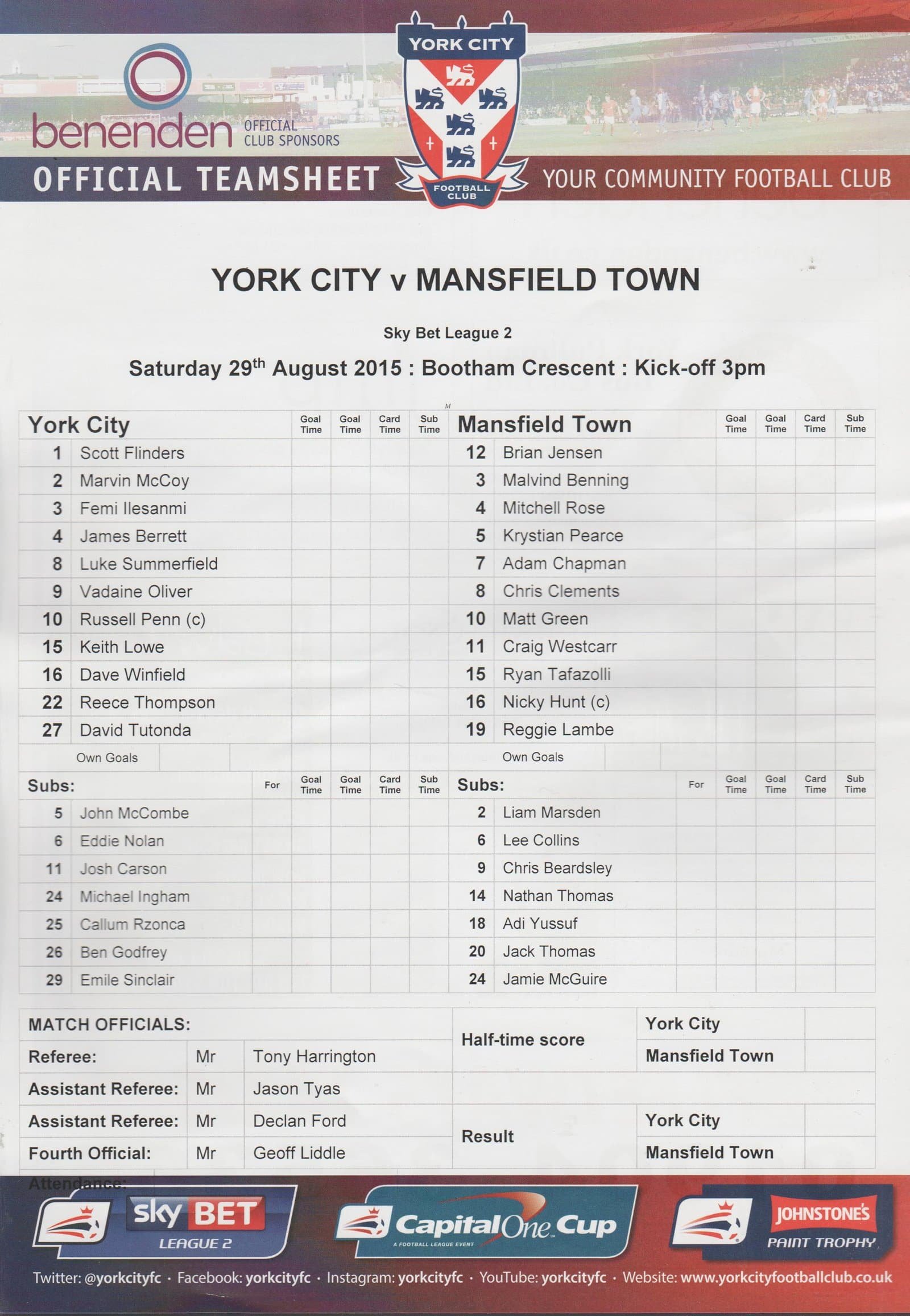 Match: York City v Mansfield Town Competition: SkyBet League 2 Date: 29-Aug-2015 Comments: Rating: 4 Condition: Very good Weight in grams: 20